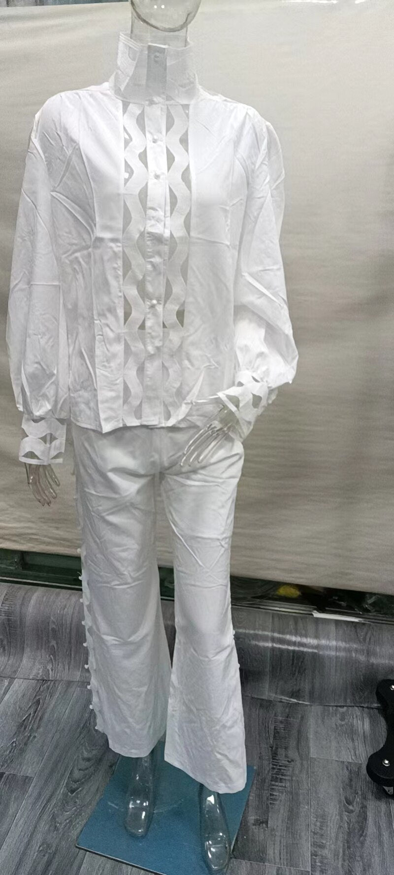 Sexy Hollow Out Two Piece Pants Sets Women Autumn Clothing Stand Collar Lantern Sleeve Shirt Pants Suits Casual 2 Pieces Outfits